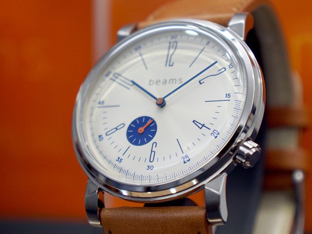 BEAMSのブランドカラーであるオレンジやブルーを差し色として配置。アラビア数字のインデックスや時分針を補足することで、文字板全体をシャープに引き締めたという。また、下半分の目盛りだけを細かく刻むことで、「クラシックな佇まいを保ちながらも、性別を問わず身に着けやすいすっきりとしたモダンな印象にしている」とアピールしている。