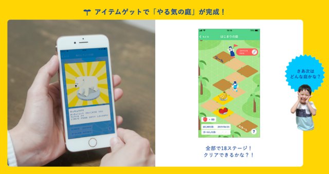 「やる気パワー」の量に応じて、アプリの「やる気の木」が成長。すごろく形式の全18ステージを進み、アイテムを獲得することで「やる気の庭」が完成するしかけだ。