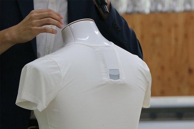 専用インナーウェアは東レインターナショナル(株)が提供。背面にあるポケット部分は端末がしっかり首元にフィットする設計になっており、端末が直接首元に接触することで冷温感を得やすく快適に感じられるとアピールする。インナーウェアの質量は約80g。