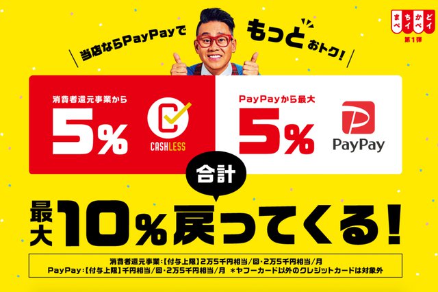 これに合わせたキャンペーンの第1弾として、PayPayでは10月1日から11月30日まで「まちかどペイペイ」を開催。この期間中は先述の最大5%に加えて、さらにPayPayが5%分を追加することで、最大10%のPayPayボーナスが付与される。このキャンペーンで追加される5%分の付与上限は1回1,000円相当で、1ヶ月の上限は25,000円相当。