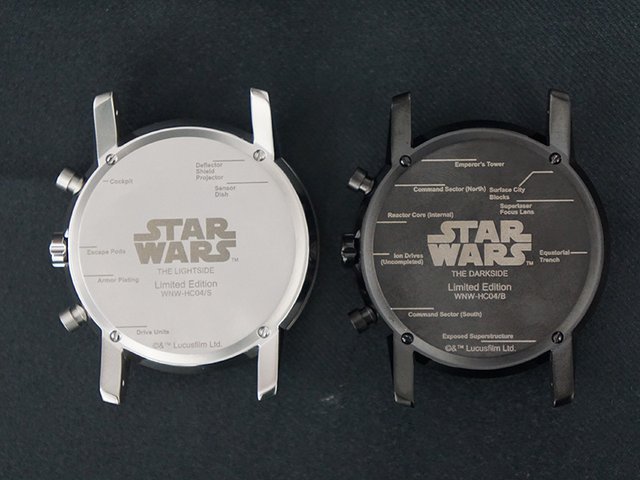 また、リュウズには“THE LIGHTSIDE”は反乱軍の紋章を、“THE DARKSIDE”は帝国軍の紋章を刻印。秒針の先には、“THE LIGHTSIDE”はXウィング風モチーフを付けてファルコンの周りを飛ぶようにし、“THE DARKSIDE”はスター・デストロイヤーを付けてデススターの周りを飛ぶようにしている。そして、盤面の設計図からはヘッド裏面に線が伸びており、ファルコン/デススター各部位の名称を裏面に刻印している。