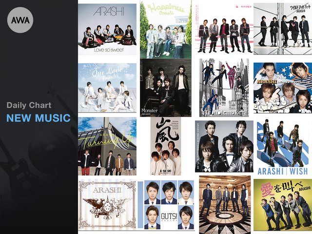 サブスクリプション型音楽ストリーミングサービス「AWA」で、2019年11月3日より全シングルの配信を開始した「嵐」の楽曲65曲が、AWAの「THE HOT 100」の1位から65位までを配信開始からわずか25分で独占。さらに、翌日11月4日の「Daily Chart NEW MUSIC」でも、1位から65位までを嵐の楽曲が独占した。