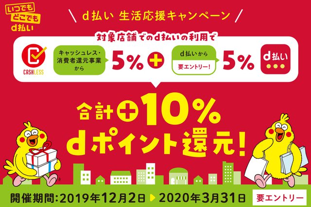 d払いでもPayPayと同じく、消費者還元事業に主軸したキャンペーン「d払い 生活応援キャンペーン」を実施。こちらは還元事業の5%に加えて、さらに5%、つまり合計10%の還元を受けられる。開催期間が長く12月2日から3月31日まで開催。なおキャンペーンページからのエントリーが必要なほか、2%還元の店舗、dカード以外のクレジットカードからの支払いは対象外としている。