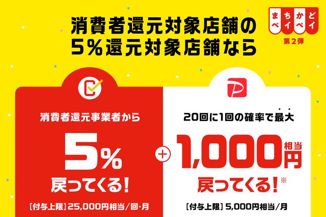 しかし今年はかなり控えめな内容で、キャッシュレス・消費者還元事業(以降、消費者還元事業)での還元に加えて “20回に1回の確率で最大1,000円相当戻ってくる” という「まちかどペイペイ第2弾」を12月から1月いっぱいにかけて実施する。