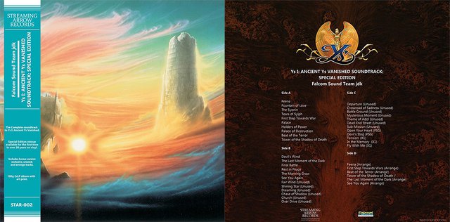 2枚組/180gの重量盤で、カラーレコード仕様として『Ys I: Ancient Ys Vanished Soundtrack』は「Black」「Translucent Light Blue」「Translucent Light Blue with Orange In Color」を、『Ys II: Ancient Ys Vanished - The Final Chapter Soundtrack』は「Black」「Opaque Red」「Black with Opaque Red and Cyan Blue Splatter」をラインナップする。