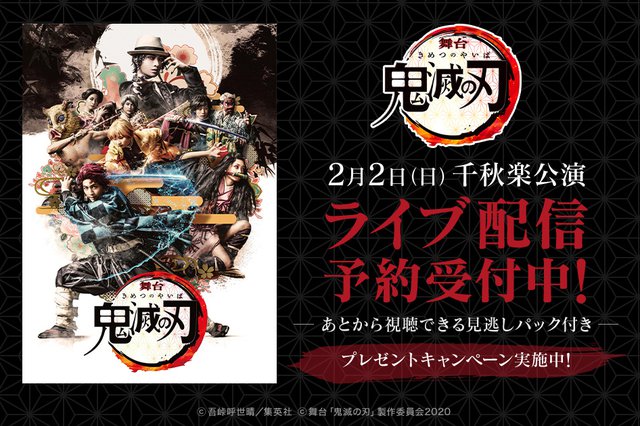 合同会社DMM.comは、2月2日(日)に行われる『舞台「鬼滅の刃」』の千秋楽公演について、ライブ配信+見逃しパック(再ライブ配信+ディレイ配信)の予約販売を開始した。予約期間は1月18日11:00から2月2日ライブ配信終了まで。価格は3,800円(税込)。
