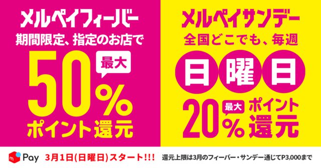 メルペイは、対象店での買い物/飲食に対して最大50%ポイント還元する「メルペイフィーバー」と、メルペイ加盟店ならどこでも毎週日曜日の買い物に対して最大20%還元する「メルペイサンデー」の2つのキャンペーンを3月に開催する。
