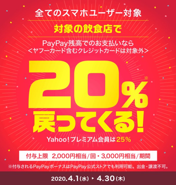 「全国の有名飲食チェーンが対象! 春のグルメまつりキャンペーン」は、期間中に対象店舗での支払いにPayPay決済を利用すると、Yahoo! プレミアム会員ユーザーは25%、それ以外のユーザーは20%のPayPayボーナスを受けられるというもの。付与上限は1回につき2,000円相当、期間中3,000円相当となる。