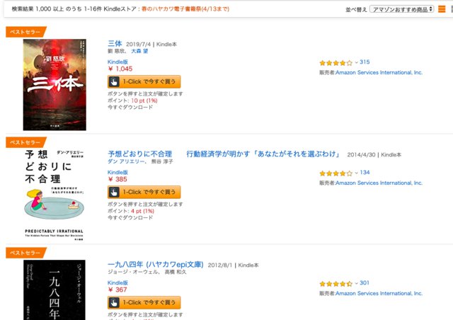 Amazonにて、早川書房のKindle本が安くなる「春のハヤカワ電子書籍祭」が開催されている。期間は4月13日まで。