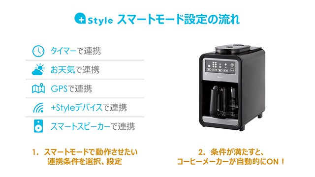 プラススタイルは、「スマート全自動コーヒーメーカー」を6月25日に発売する。価格は13,800円(税込)。アプリや音声操作に対応し、同社製スマートセンサーとも連携可能。朝、寝室のドアを開けると自動でコーヒーを淹れ始める…といった使い方ができるのが特徴だ。