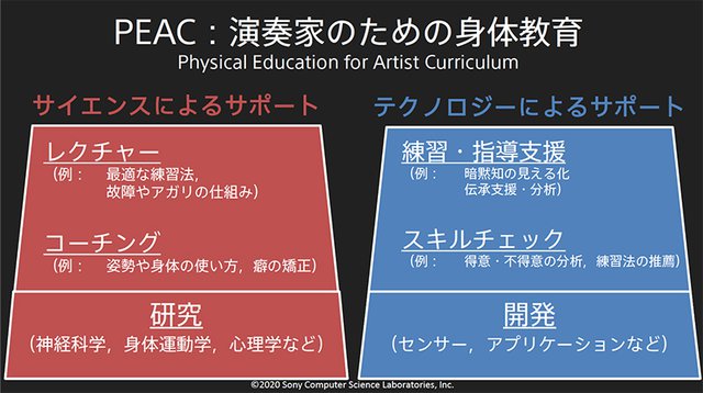 ソニーCSLが開発した「Physical Education for Artist Curriculum (PEAC)」を活用し、高精度センシングシステムを用いた受講生の動きの癖や演奏中の姿勢、感覚運動機能などの認識を促すという。また、科学研究の成果に基づく効率の良い暗譜の方法や不要な力みの回避方法なども指導する。