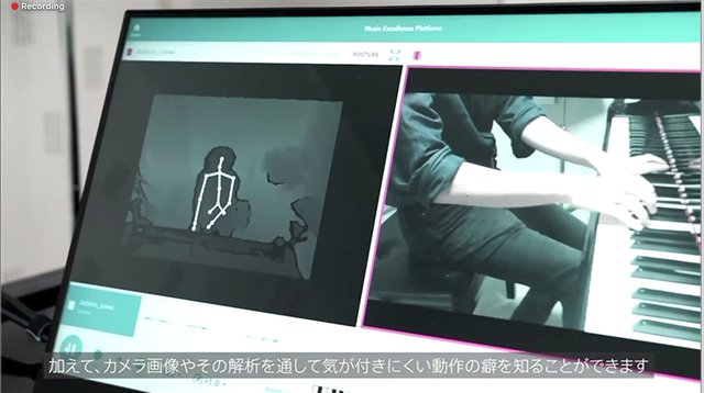 ピアノの鍵盤の中に非接触で動きや強弱を計測できるセンシングシステムを配置、また姿勢を図るセンサーや複数カメラで演奏の様子を記録して分析する。これらのシステムはどのピアノにも後から実装可能とのこと。
