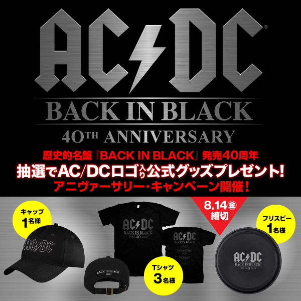 同アカウントをフォローしてキャンペーン告知ツイートをRTし、ハッシュタグ「#BackInBlack祝40周年」をつけて「アルバム再生リンクURL(https://acdc.lnk.to/BackinBlackTC)」と“あなたのAC/DCの思い出”をツイートすることで応募は完了。応募者の中から抽選でAC/DCロゴ入りTシャツが3名、ロゴ入りフリスビーとロゴ入りキャップが各1名ずつにプレゼントされる。
