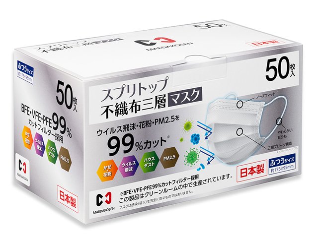 前田工繊は、BFE(バクテリア飛沫捕集(ろ過)効率)、VFE(ウイルス飛沫捕集(ろ過)効率)、PFE(微粒子捕集(ろ過)効率)が全て99%以上を実現したという国内生産の使い捨て不織布マスクを、9月7日(月)正午よりAmazonにて販売する。1箱50枚入りで価格は2,000円。20箱(1,000枚)40,000円のケース販売も用意する。