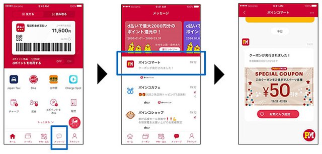 メッセージメニューは、街の店で「dポイントカード」を提示したり「d払い」で支払いをした際に、店からお得なキャンペーン情報やクーポン、チラシなどが届くようになるというもの。届いたメッセージは店ごとのタイムライン表示になっており、簡単に内容の確認や配信停止の設定などが行える。