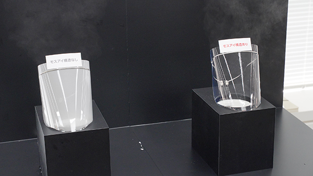 さらに、モスアイ構造と新開発の超親水性アクリル系樹脂を組み合わせたことで、表面に付着した水滴がすばやく広がり、蒸発しやすくなっている。これにより、呼吸による曇りや温度差による結露を抑制している。