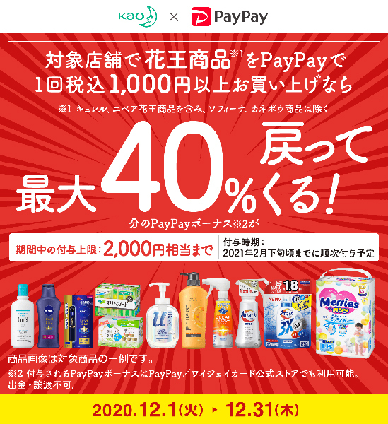 1回の支払いで花王商品の購入金額が税込1,000円以上の場合に対象となる。期間中の付与合計上限は2,000円相当まで。PayPayボーナスとして2021年2月下旬に付与される予定。