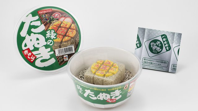 緑のたぬきとルービックキューブがなぜかコラボ。天ぷらと麺を揃える「緑のたぬききゅーぶ」