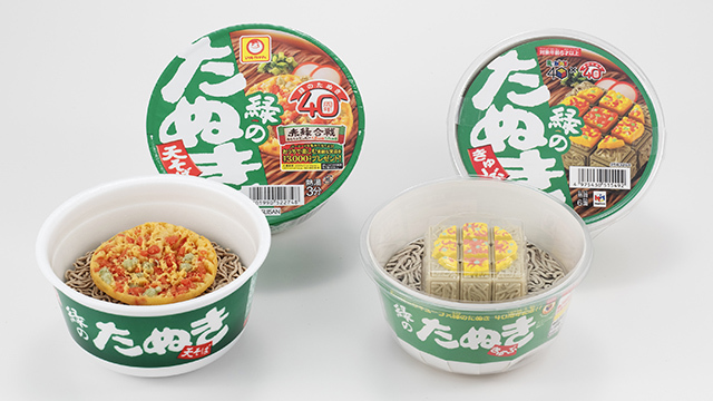 東洋水産(株)と(株)メガハウスは、カップ麺「緑のたぬき天そば」と「ルービックキューブ」がそれぞれ今年で40周年を迎えたことを記念したコラボレーション製品「緑のたぬききゅーぶ」を12月25日より発売する。価格は2,980円(税抜)。