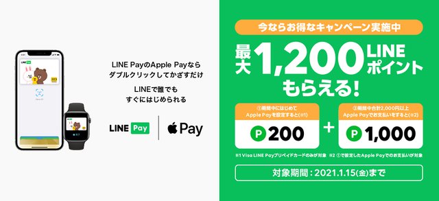 LINEが展開するモバイル送金・決済サービス「LINE Pay」は、「Apple Pay」の対応を記念して、最大でLINEポイント1,200ポイントをプレゼントするキャンペーンを実施する。開催期間は本日1月6日(水)から1月15日(金)まで。