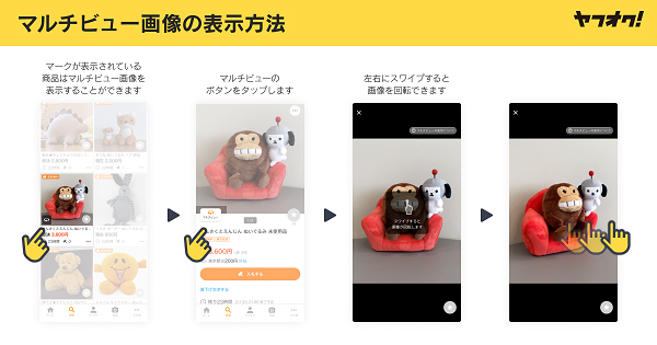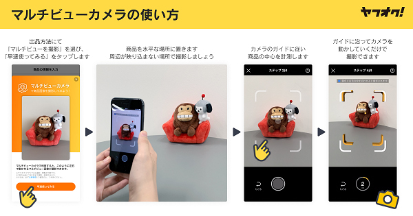 マルチビュー機能は、コンピュータによる視覚の実現を研究する分野であるコンピュータビジョンの技術や、スマートフォンのOS各社が提供するAR技術のフレームワークを活用し、ターンテーブルや専用カメラなど特殊な機材を使用せず、立体的な商品を多視点で撮影できるというもの。本機能を、Yahoo! JAPAN内サービスで初めてヤフオク!にて実用化した。