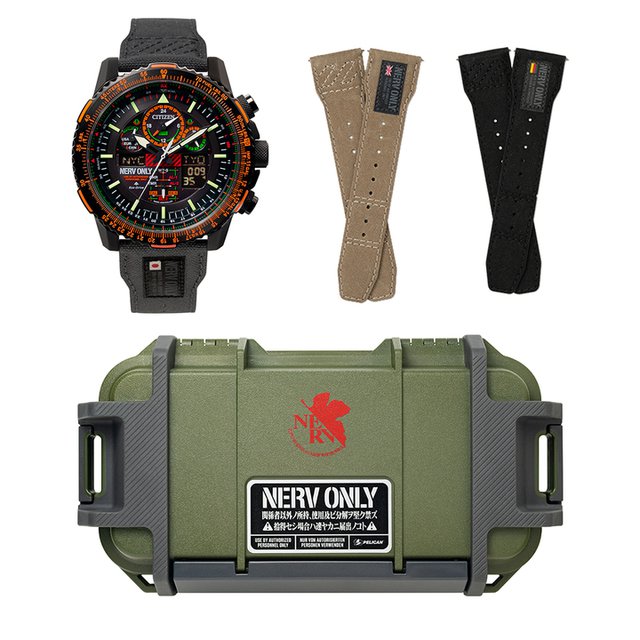 両セットに共通する時計ヘッド部にはシチズンの「PROMASTER」ブランドのワールドタイム エコ・ドライブ電波時計を有する、アナログとデジタルが一つになったコンビネーションクオーツ時計を採用。デジタル表記部の液晶搭載に伴い、文字板のデザインにも劇中のモニタデザインのエッセンスを反映。特務機関NERVのインダストリアルデザインに合わせ、指し色にオレンジを、インデックスと針部にはグリーンの夜光塗料を用いている。