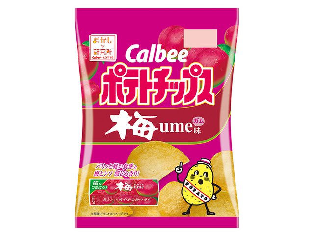 「トッポ<とうもりこ>」、「おおきなパイの実<しあわせバタ〜>」を発売するなど、両社の代表的商品を掛け合わせたお菓子を次々に生み出してきた共同開発商品第4弾。『“どんな味がするのだろう?”とお客様にワクワク、ドキドキしていただける味を追求し、ロッテのロングセラー商品「ブルーベリーガム」と「梅ガム」の味わいをカルビーのポテトチップスで再現する運びとなりました。特に板ガムが好きな30〜50代の男女に楽しんでいただきたい商品です』と説明している。