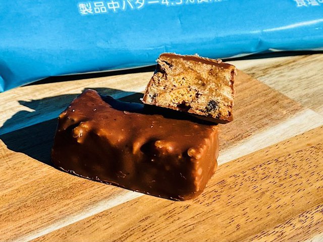 フランス産発酵バターを使用し、香ばしく焼き上げたこだわりの自社製のバタービスケットを使用した商品。バタービスケットの中には、噛むたびに香ばしさが引き立つようにローストアーモンドを配合するとともに、アクセントとして、センターチョコレートに焦がしバターオイルを溶かして配合している。