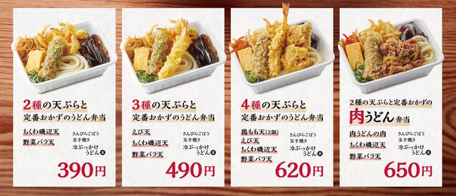 ラインナップは「2種の天ぷらと定番おかずのうどん弁当」(390円)、「3種の天ぷらと定番おかずのうどん弁当」(490円)、「4種の天ぷらと定番おかずのうどん弁当」(620円)、「2種の天ぷらと定番おかずの肉うどん弁当」(650円)の4種類。
