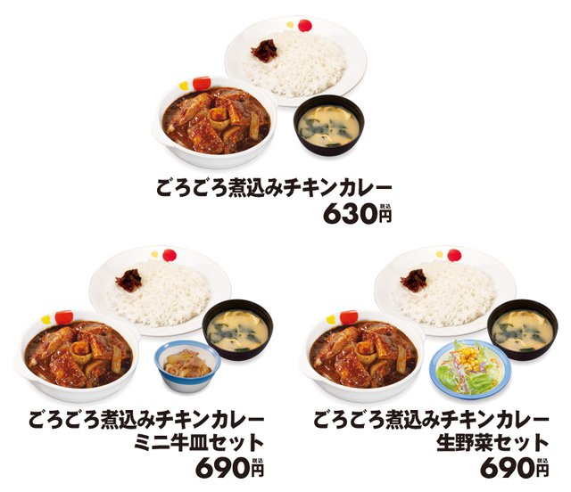 また、「ごろごろ煮込みチキンカレー」にミニ牛皿の牛肉をちょい足しした「ごろチキカレギュウ」、 生野菜をつけて「ごろチキ定食」がそれぞれ並690円/大盛790円とお得なセットとして用意される。