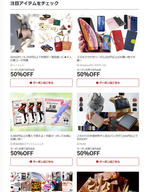 スマートフォンの画面保護シートやスマホケースといったモバイル関連や家電を含め、グルメ、ファッションまで幅広いアイテムで最大50%オフクーポンが配布中。事前配布されているクーポンの詳細はセールページで確認できる。