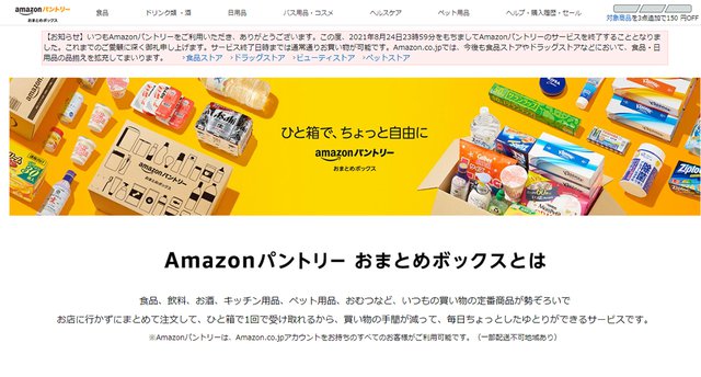 Amazon.co.jpは、同社の展開するサービス「Amazonパントリー」を終了すると発表。8月24日(火)の23時59分をもってサービスの提供を終了する。