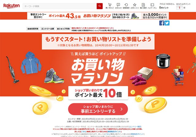 楽天市場は、複数のショップで買い物をすることなどでポイントが最大43.5倍になる恒例セール「お買い物マラソン」を本日10月4日20時から開始する。セール期間は10月11日(月)1時59分(10日深夜25時59分)まで。