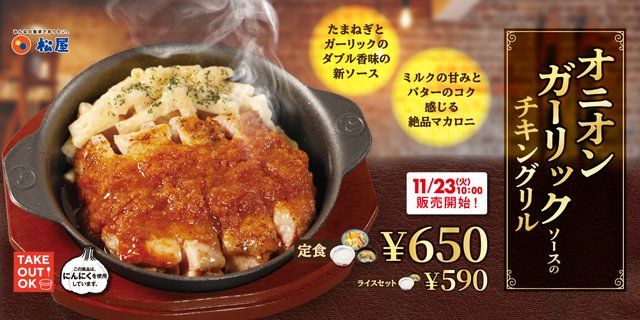 ・西日本地域限定「オニオンガーリックソースのチキングリル」 650円(定食)/ 590円(ライスセット)