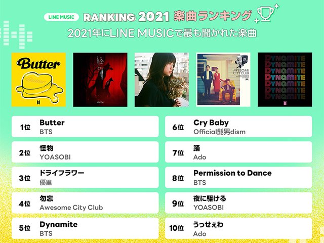 楽曲1位は「Butter」!YOASOBI、優里が続く