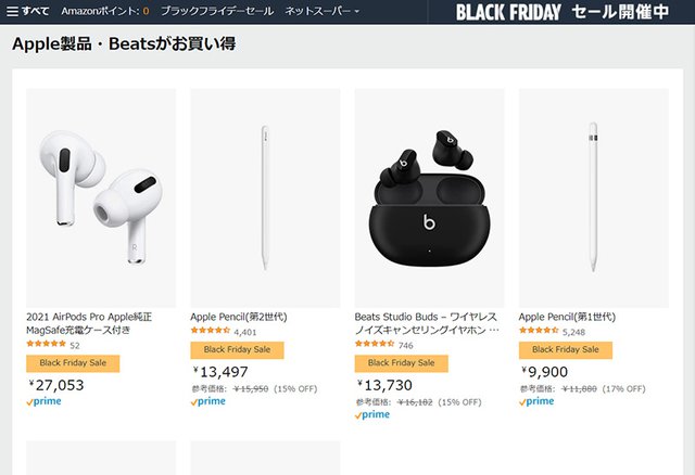 まず注目はAirPods Pro。在庫が切れたのか、一時表示されない状態になっていたようだが、現在は再び購入できるようになっている。Apple製品は、その名もズバリ「Apple製品・Beatsがお買い得」コーナーが展開されており、Apple Pencilやbeatsの完全ワイヤレスもセール対象になっている。
