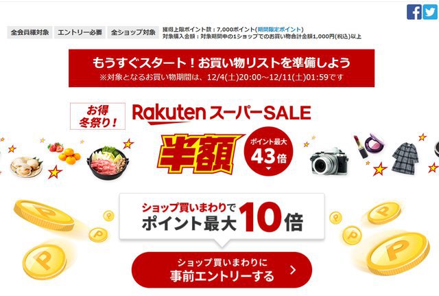 楽天市場の開催する大型セールイベント「楽天スーパーSALE」がいよいよ本日12月4日20時から12月11日(土)1時59分(10日深夜25時59分)までの期間で開催される。
