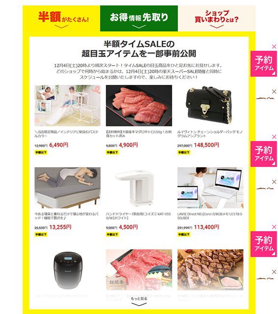 先行掲載の超目玉アイテムのほか、半額タイムSALEの割引対象商品は、20時の楽天スーパーSALE開始と同時に販売店、販売開始時間がアナウンスされるとのこと。目当てのアイテムを必ず手に入れたい、お得な割引商品を見つけたい場合にはセール開始と同時にキャンペーンページをチェックしよう。