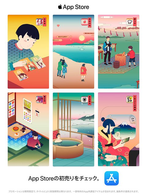 アップルのアプリダウンロードサービスであるApp Store、Apple Music、Apple Books、Apple TV、Podcastが新年限定の各コンテンツサービスを実施する。期間中は各サービスのキービジュアルも新年を祝うポップな木版画超の装いに一新し、正月ムードを盛り上げる。