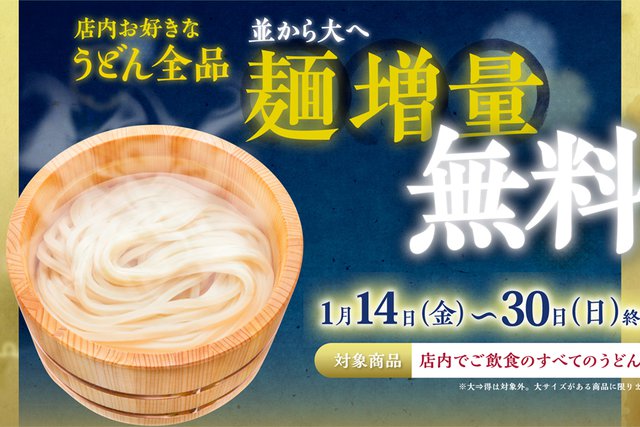 丸亀製麺は、うどん全品対象の麺増量無料キャンペーンを、1月14日から30日の期間限定で実施する。