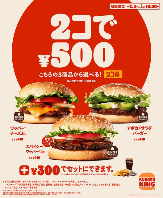 バーガーキングは、「スパイシーワッパー Jr.」「ワッパーチーズ Jr.」「アボカドサラダバーガー」の3商品から、好みの2商品を選択して500円で買える「2コ得(ニコトク)」キャンペーンを、1月21日から2月3日までの14日間限定で実施する。なお、販売は各日10時30分から。