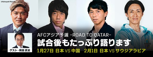 2月1日のサウジアラビア戦では、解説に佐藤寿人氏、ゲストに岡田武史氏を迎えて配信。直後の『THE REVIEW』には、佐藤寿人氏、中村憲剛氏、矢部浩之氏が出演する。