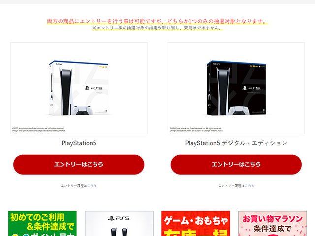 対象は、PlayStation5およびPlayStation5 デジタル・エディション。両方の商品にエントリーを行うことは可能だが、どちらかひとつのみの抽選対象となる。