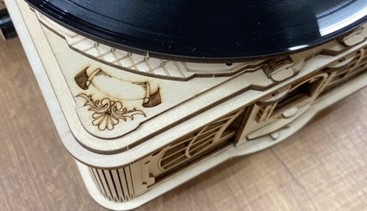 デザインは1880年代ごろに流通していた蓄音機を思わせるようなアンティークなもので、側面は複数のパーツで非常に細かくなっている。また、レコード盤の回転速度や、音楽のボリューム調節も行える。