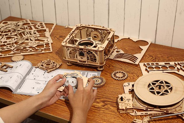 本物のレコードが再生できるウッドパズル「奏でる蓄音機」。“つくるんです”史上最高級の難易度