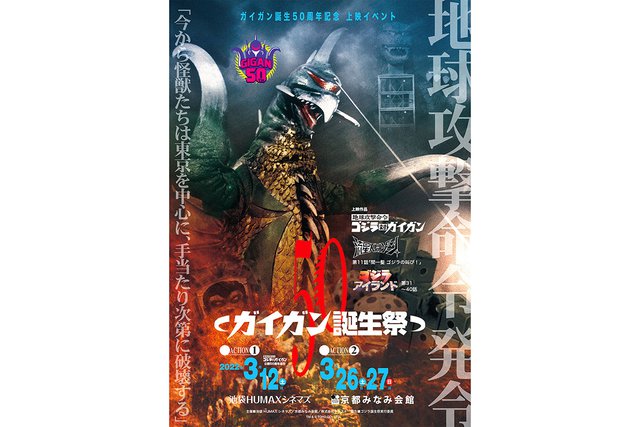 本上映イベントは、2022年に生誕から50周年を迎えるガイガンを記念して、昨年開催のゴジラ・フェス2021内で発表された「ガイガン50(ガイガン・フィフティ)」企画のスタートを飾るものとなる。3月12日にヒューマックスシネマ池袋、3月26日・27日に京都みなみ会館にて開催される。