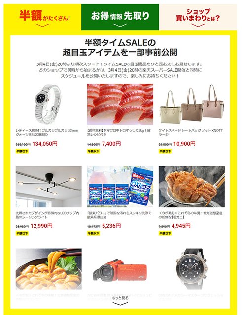 楽天市場は、半額以下の商品を多数用意するほか、ポイントが最大43倍獲得できるセール「RakutenスーパーSALE」を今週3月4日(金)20時から開始する。セール期間は3月11日(金)1時59分まで。またこれに先立ち、ポイントアップのための事前エントリー受付や、割引クーポンの配布を開始している。