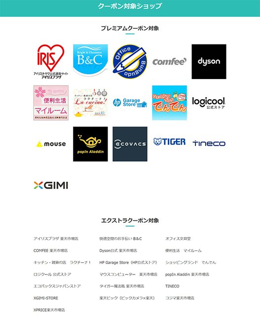 AV機器やガジェット製品系では、上記のpopIn Aladdinやロジクールの他、マウスコンピューター、HP、XGIMIなどの楽天公式ショップもキャンペーンに参加中。大手量販店系では楽天ビックとコジマ楽天市場店、アイリスオーヤマも参加している。
