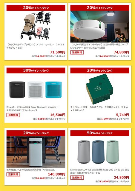 AV機器やガジェット関連アイテムでは、例えばボーズのワイヤレススピーカー「SoundLink Color Bluetooth speaker II」や、照明一体型プロジェクター「popIn Aladdin SE」、OPPOのSIMフリースマートフォン「A73」などがスーパーDEALに登場中。エレクトロラックスの空気清浄機が実質半額の50%ポイントバックなど、AV機器以外のアイテムも各種対象になっている。