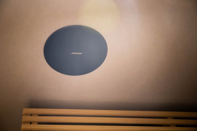 肝心のオーディオシステムについて。テーブルにロジクールのBluetoothトランスミッターが置かれており、ペアリングしたスマートフォンなどから音楽を自由に再生できる。スピーカーは、休憩室の天井(インフィニティチェアの真上)と、サウナ室で寝転がったときにちょうど頭の下にくるような位置に設置されている。スピーカーはいずれもBOSE製のものが組み込まれている。
